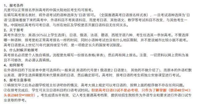 ②在報考完成后,學生可關注日語科目的口語考試時間。但是高考日語口試不是必考項,只作為了解掌握(朗讀40分+口頭表達60分=100分)。考生成績當年有效,記入考生普通高考檔案,提供給招生院校作為外語專業和要求進行外語口試專業錄取的參考。