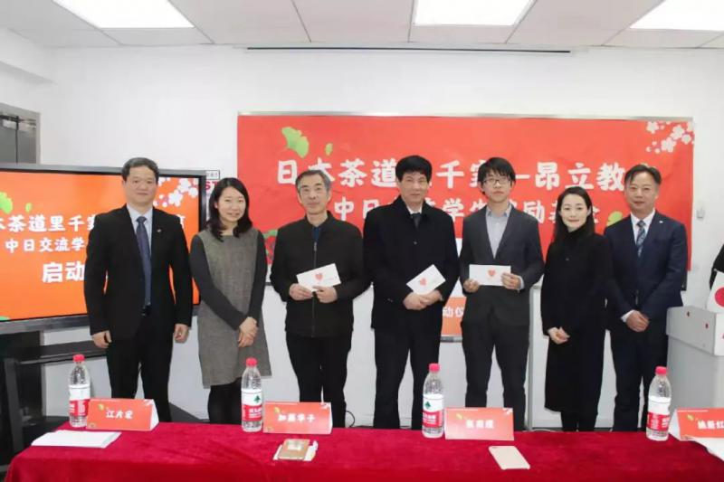加藤華子領(lǐng)事、張南攬教授、江老師共同為“日本茶道里千家——昂立教育中日交流獎(jiǎng)勵(lì)基金”揭幕。